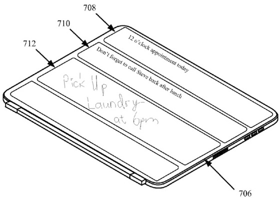 La novità davvero particolare di questa Smart Cover brevettata da Apple riguarda il pannello più vicino al dispositivo, che non è più formato dallo stesso materiale della restante custodia, ma diventa un vero e proprio display aggiuntivo.