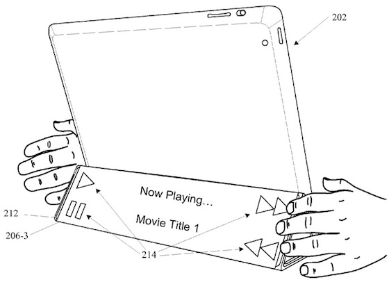 Emergono altre informazioni su questo brevetto. La Smart Cover, infatti, si presta a diversi utilizzi, come ad esempio quello di controller multimediale quando visualizziamo un film o ascoltiamo un brano dall’iPad:
