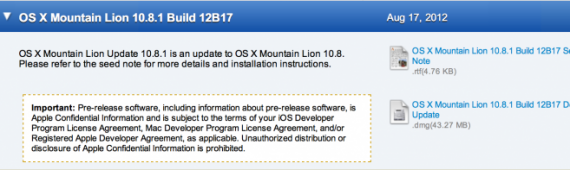 Dopo aver rilasciato la build 12B13 di OS X Mountain Lion 10.8.1, a distanza di meno di una settimana l’azienda californiana ha inviato agli sviluppatori la nuova build 12B17 agli sviluppatori. Con questo rilascio Apple chiede che gli sviluppatori si concentrino su Active Directory, iCal Microsoft Exchange nell’applicazione Mail, i proxies PAC in Safari, SMB, USB, Wi-Fi ed audio quando connessi ad un Thunderbolt Display.